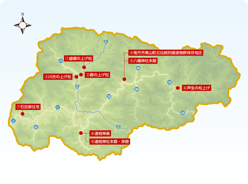 美山地区 日吉地区 園部地区 八木地区 「美山地区の文化財」詳細ページはこちら ① 盛郷の上げ松 ② 殿の上げ松 ③ 川合の上げ松 ④ 南丹市美山町北伝統的建造物群保存地区 ⑤ 八幡神社本殿 ⑥ 芦生の松上げ ⑦ 石田家住宅 ⑧ 道相神楽 ⑨ 道相神社本殿・拝殿